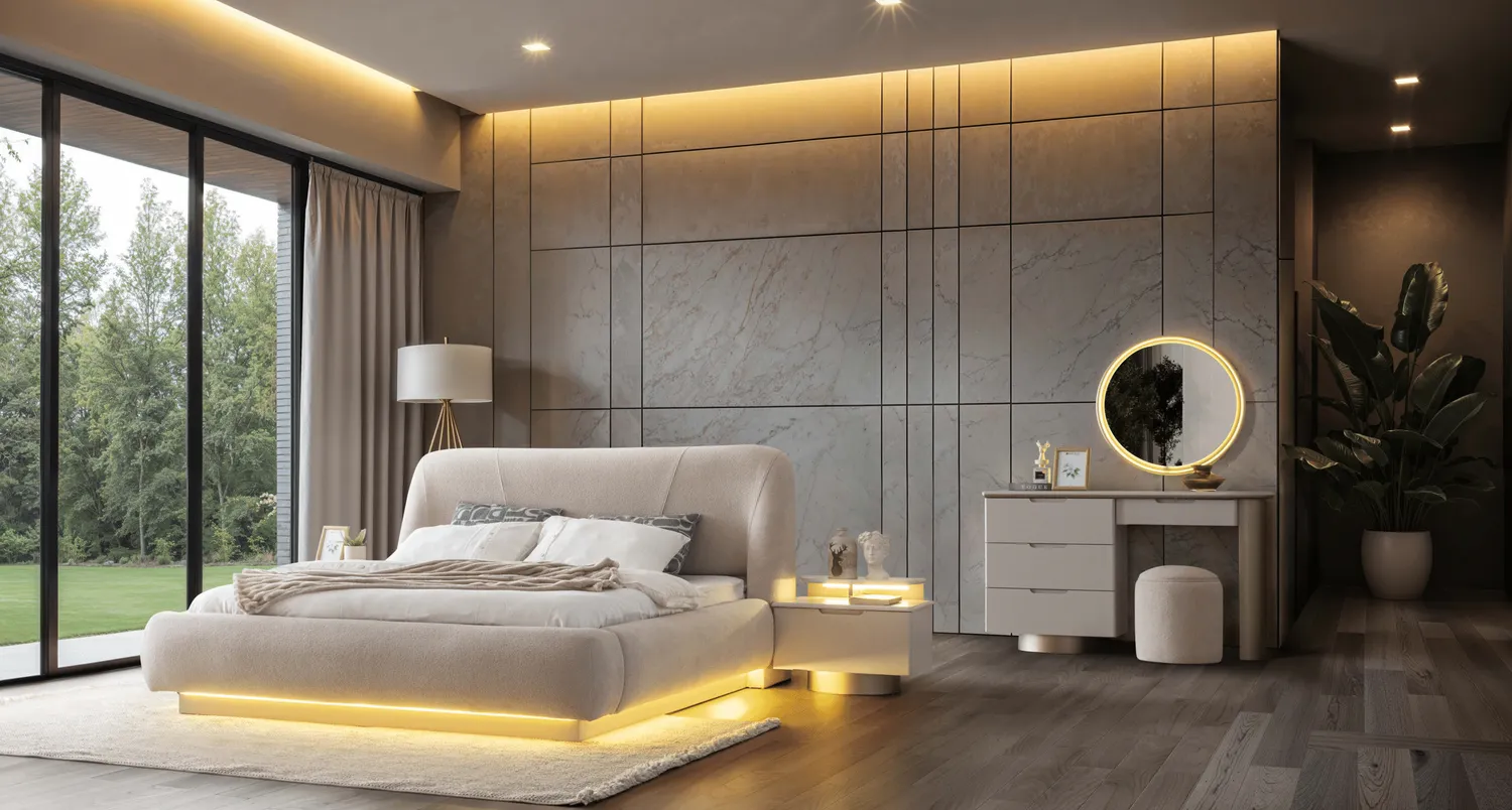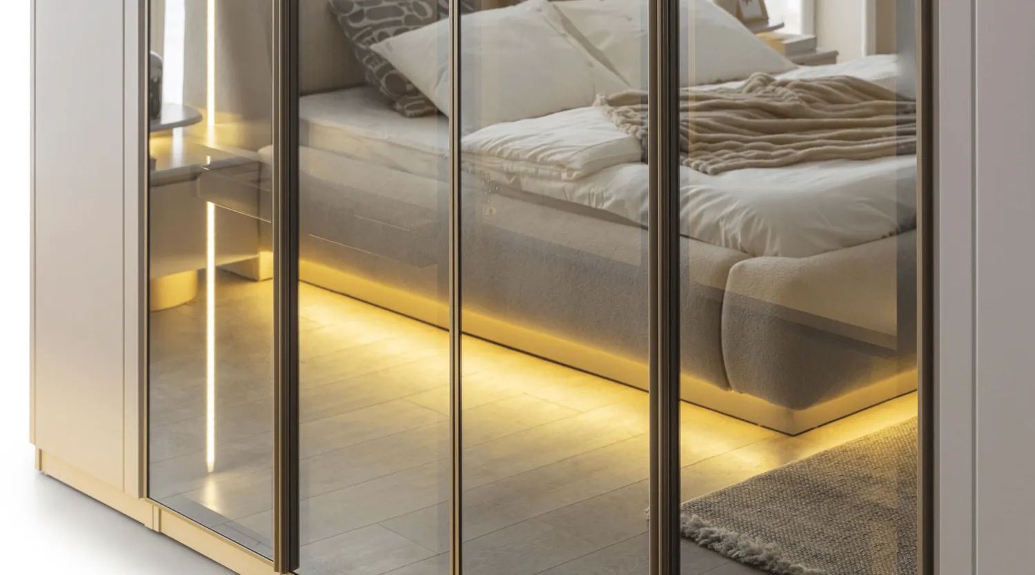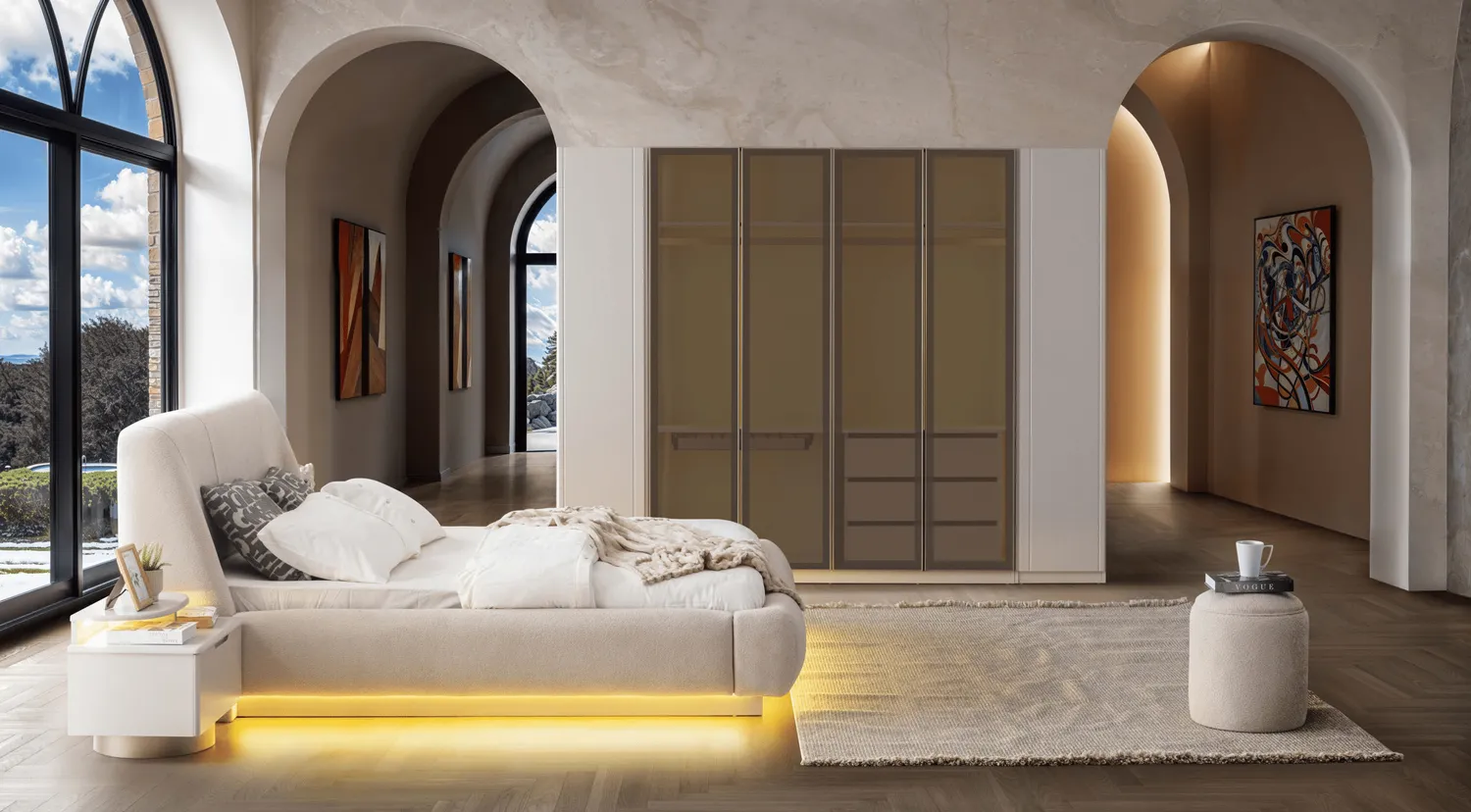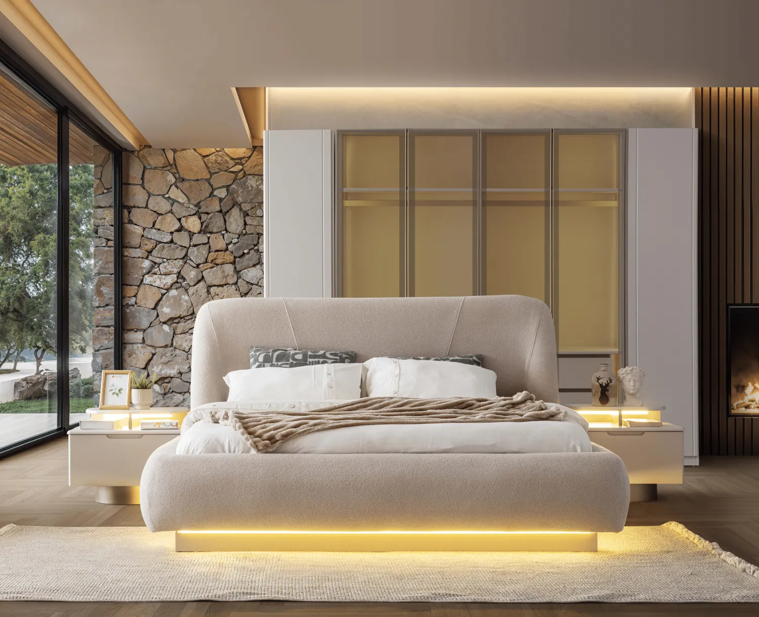 Bianca Yatak Odası Takımı, modern cam detaylı dolap tasarımı ve zarif LED aydınlatmalı karyola yapısıyla lüks ve konforu bir araya getirir. Yumuşak dokulu başlık formu, alt baza LED aydınlatması ve geniş depolama alanı sayesinde hem estetik hem fonksiyonel bir yatak odası sunar.