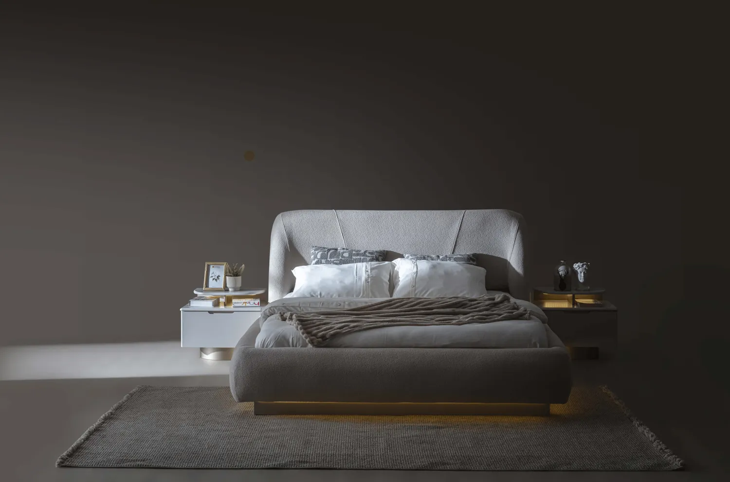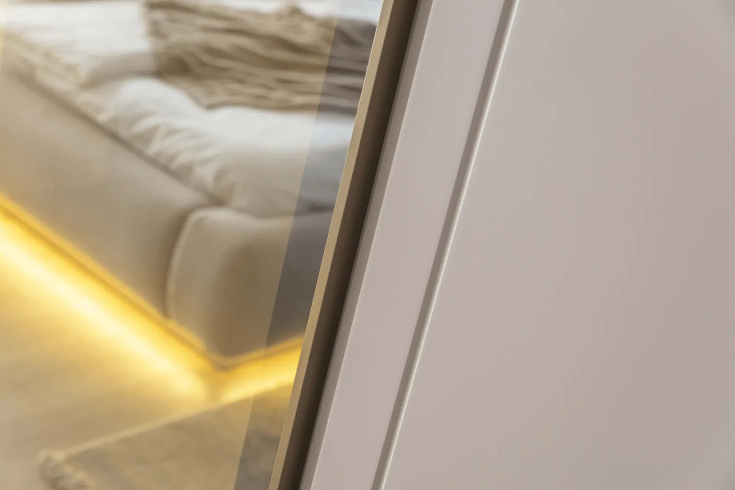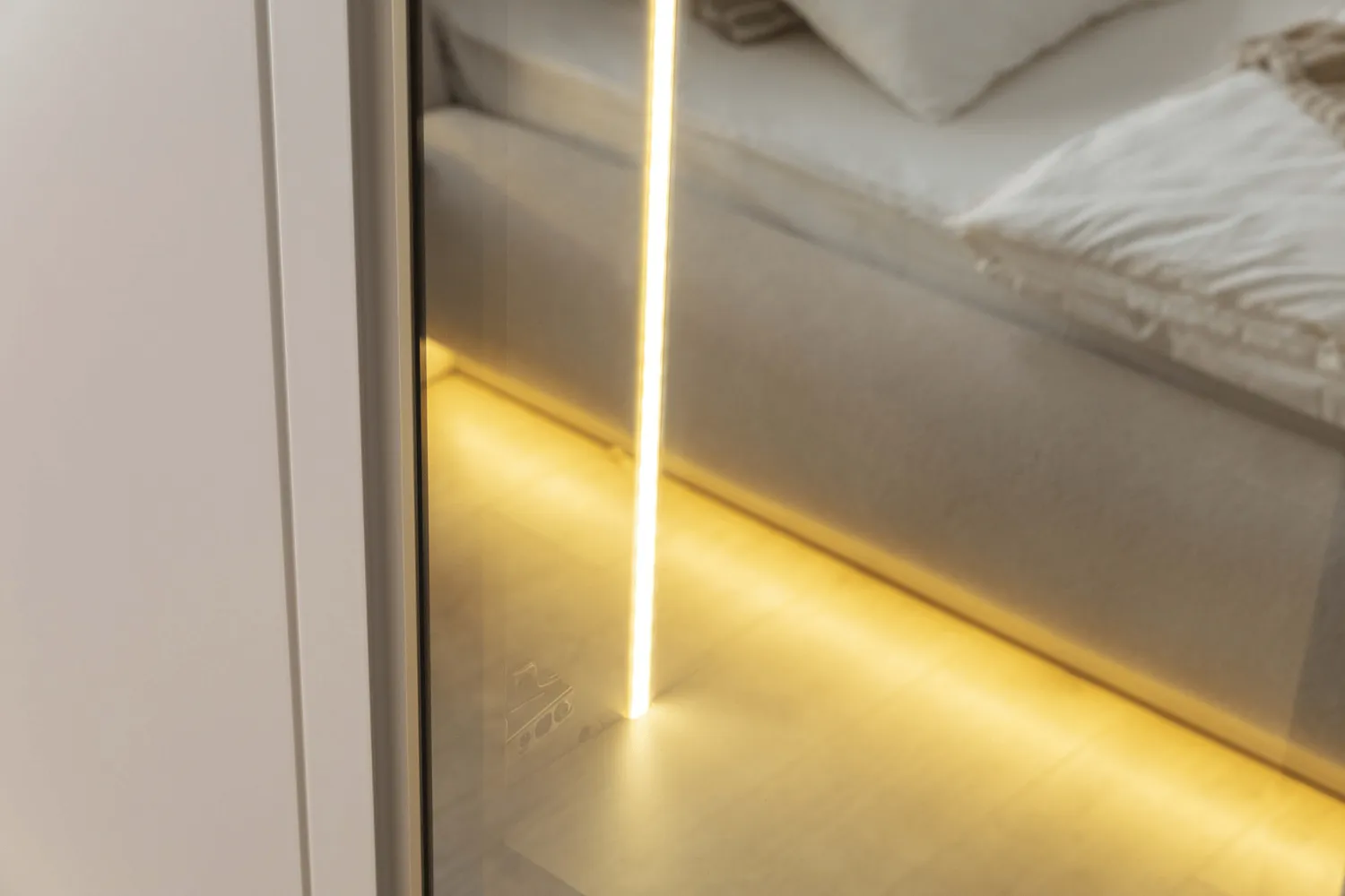 Bianca Yatak Odası Takımı, modern cam detaylı dolap tasarımı ve zarif LED aydınlatmalı karyola yapısıyla lüks ve konforu bir araya getirir. Yumuşak dokulu başlık formu, alt baza LED aydınlatması ve geniş depolama alanı sayesinde hem estetik hem fonksiyonel bir yatak odası sunar.