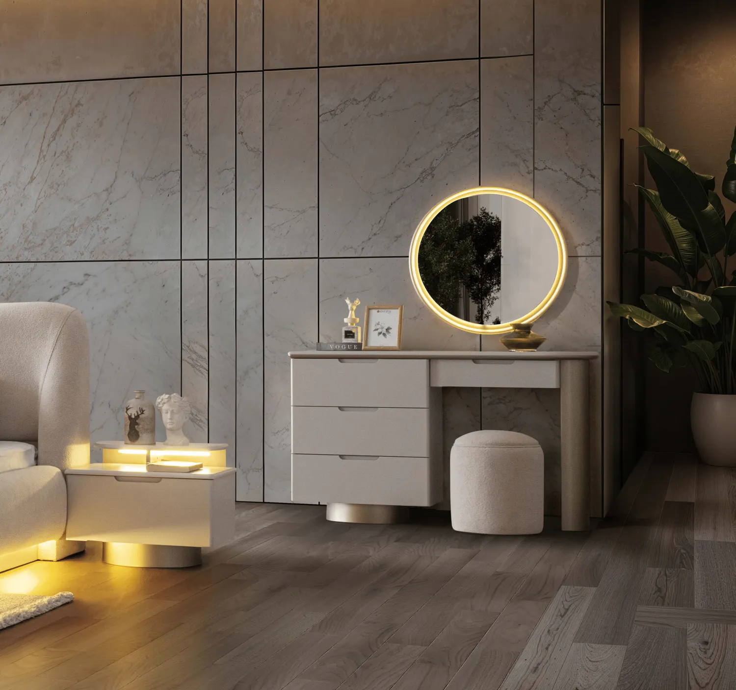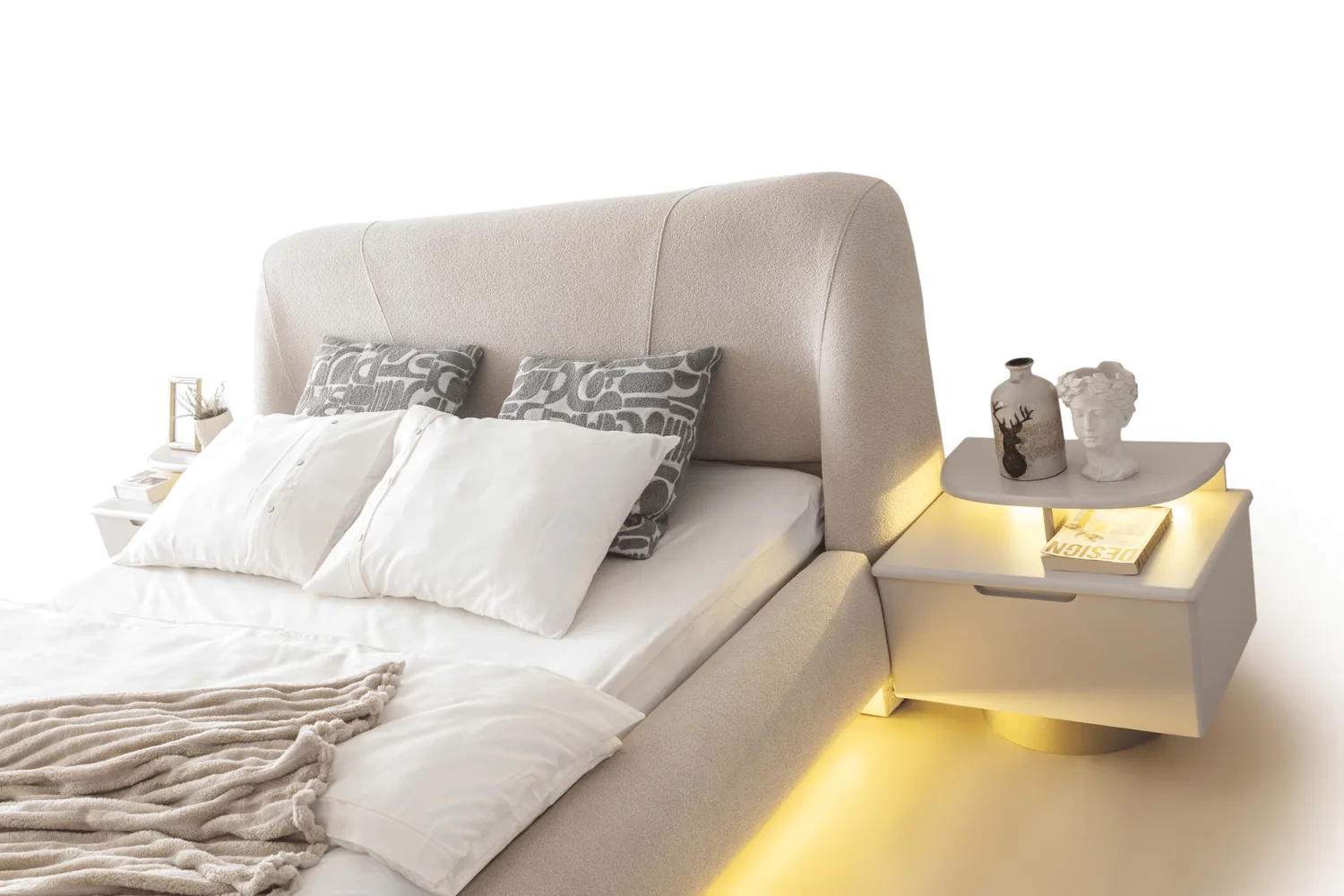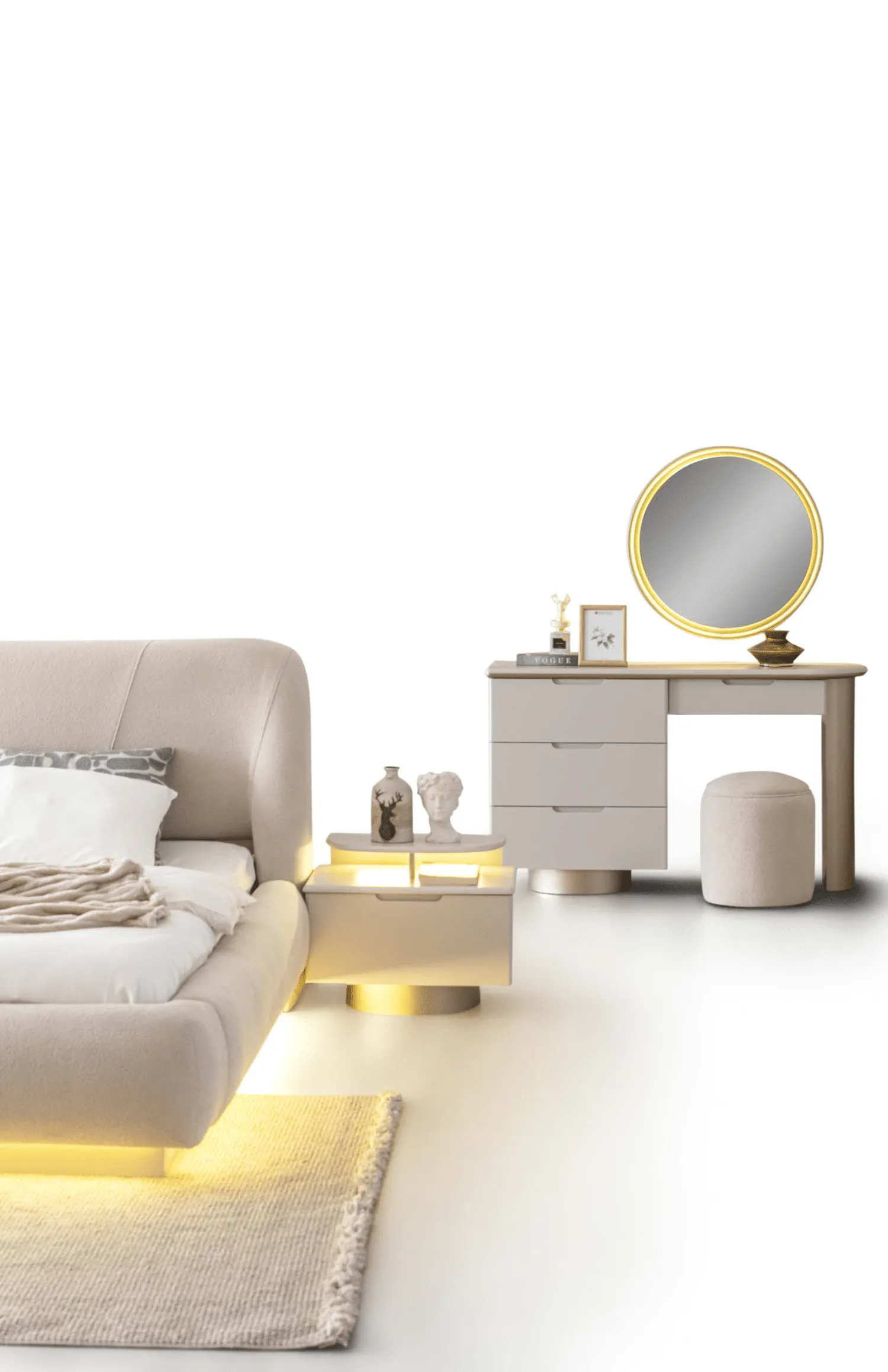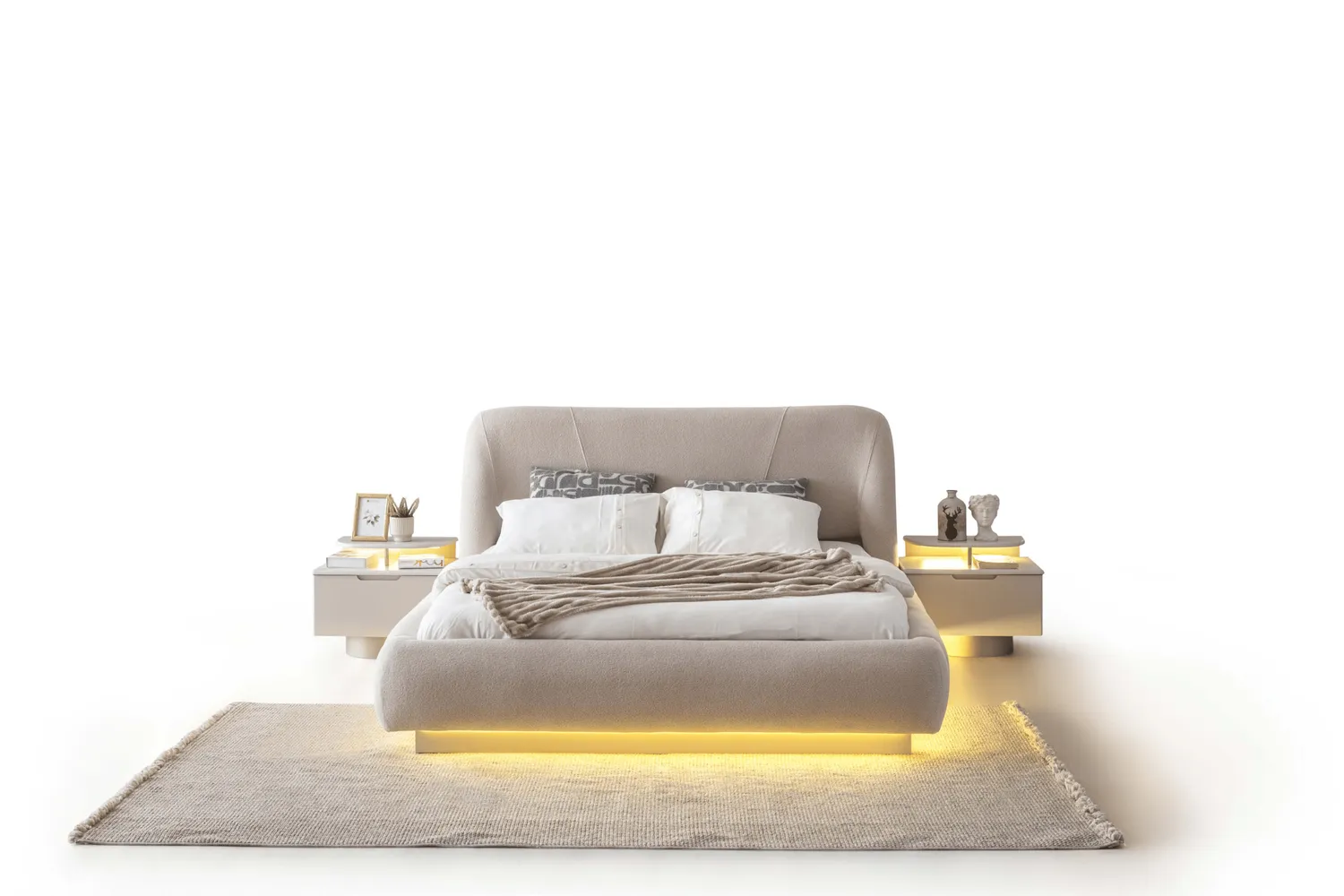 Bianca Yatak Odası Takımı, modern cam detaylı dolap tasarımı ve zarif LED aydınlatmalı karyola yapısıyla lüks ve konforu bir araya getirir. Yumuşak dokulu başlık formu, alt baza LED aydınlatması ve geniş depolama alanı sayesinde hem estetik hem fonksiyonel bir yatak odası sunar.