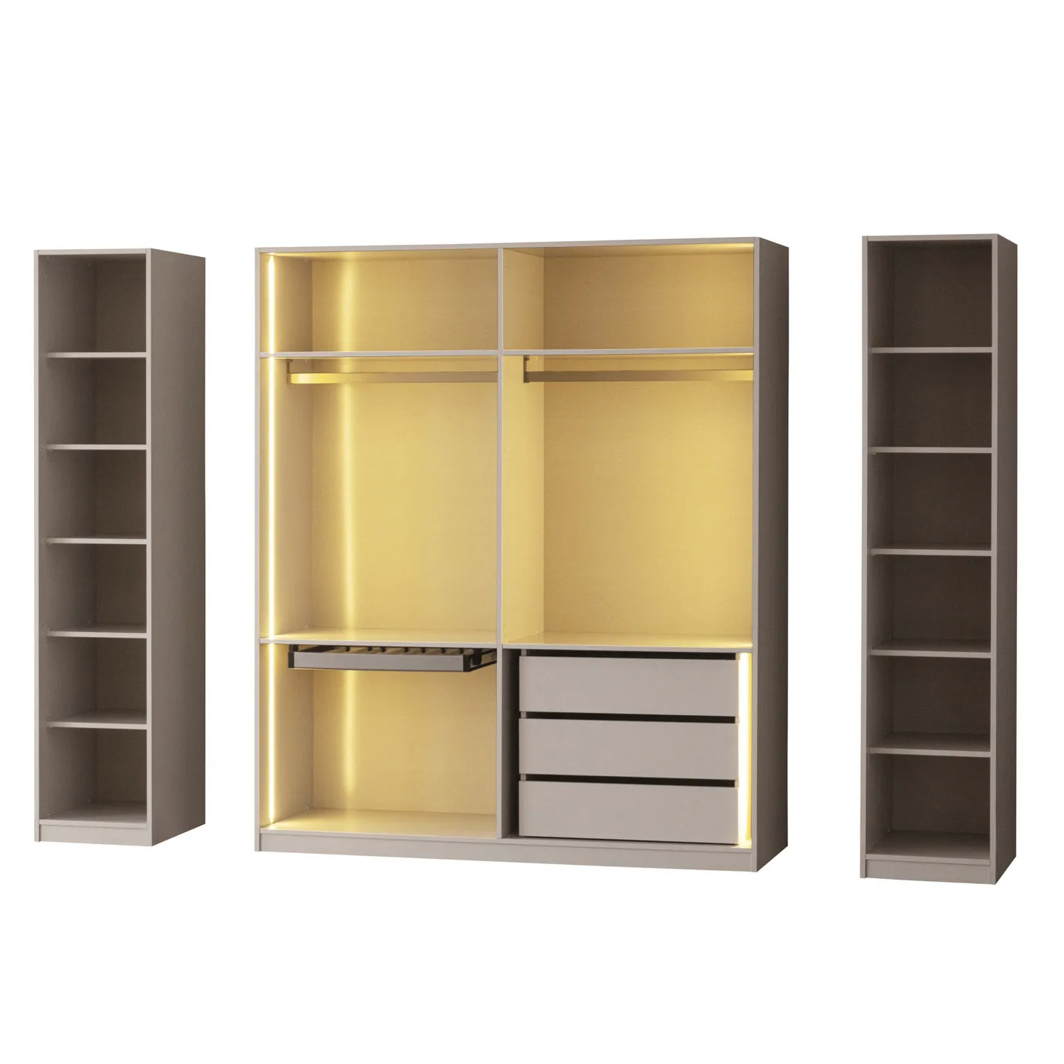 Modüler dolap sistemi sayesinde alanınıza uygun kombinasyon oluşturabilir, tekli ve çoklu modüllerle ihtiyacınıza göre genişletme yapabilirsiniz. Modern çizgileri ve sade renk geçişleriyle hem çağdaş hem zamansız bir dekorasyon sağlar.