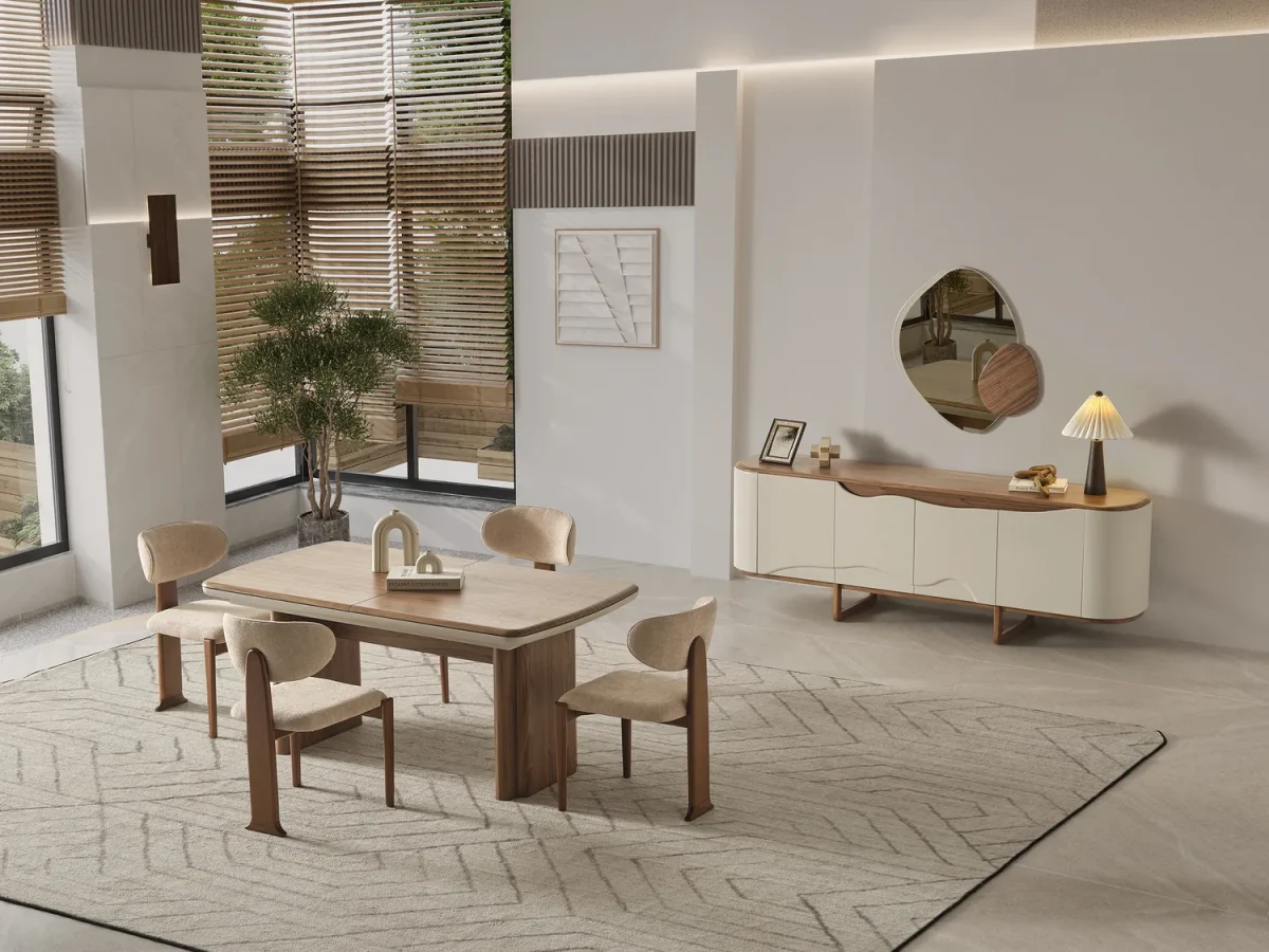Yumuşak geçişli hatlara sahip konsol tasarımı, estetik görünümünün yanı sıra geniş depolama alanı sunar. Açılabilir masa mekanizması sayesinde Calista Ceviz Yemek Odası Takımı, kalabalık davetlerde ekstra kullanım alanı sağlar. Bukle kumaş kaplı ergonomik sandalyeler ise uzun süreli oturumlarda yüksek konfor sunar.