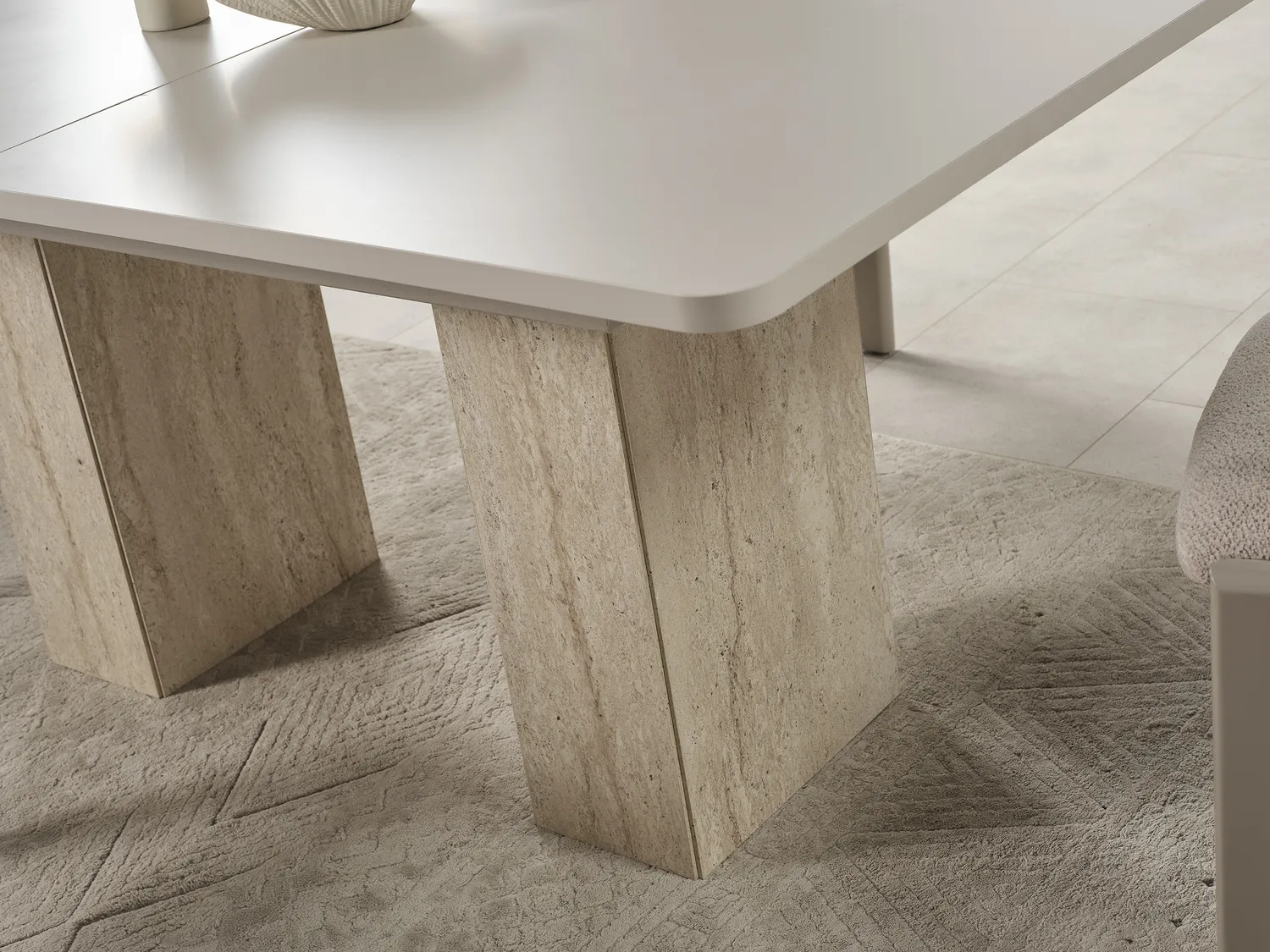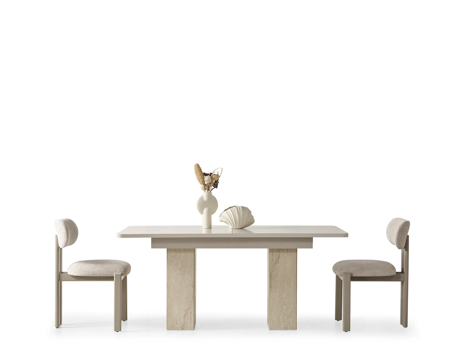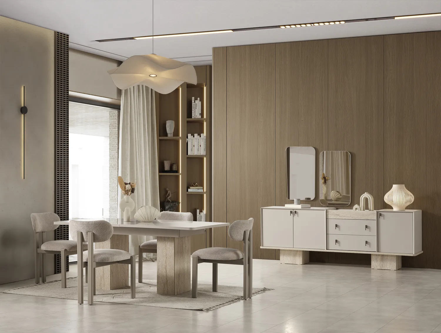 Geniş masa yapısı sayesinde aile yemekleri ve misafir davetleri için konforlu bir kullanım sunarken, depolama alanı geniş konsol ünitesiyle hem estetik hem fonksiyonel bir çözüm sağlar.