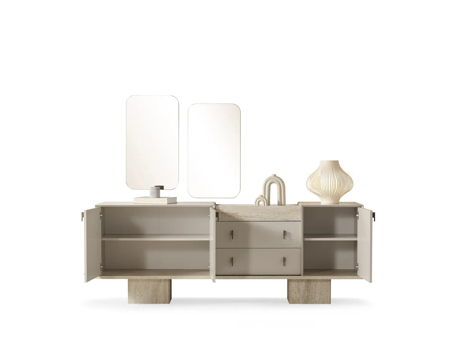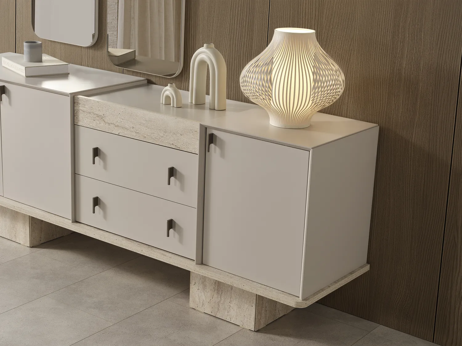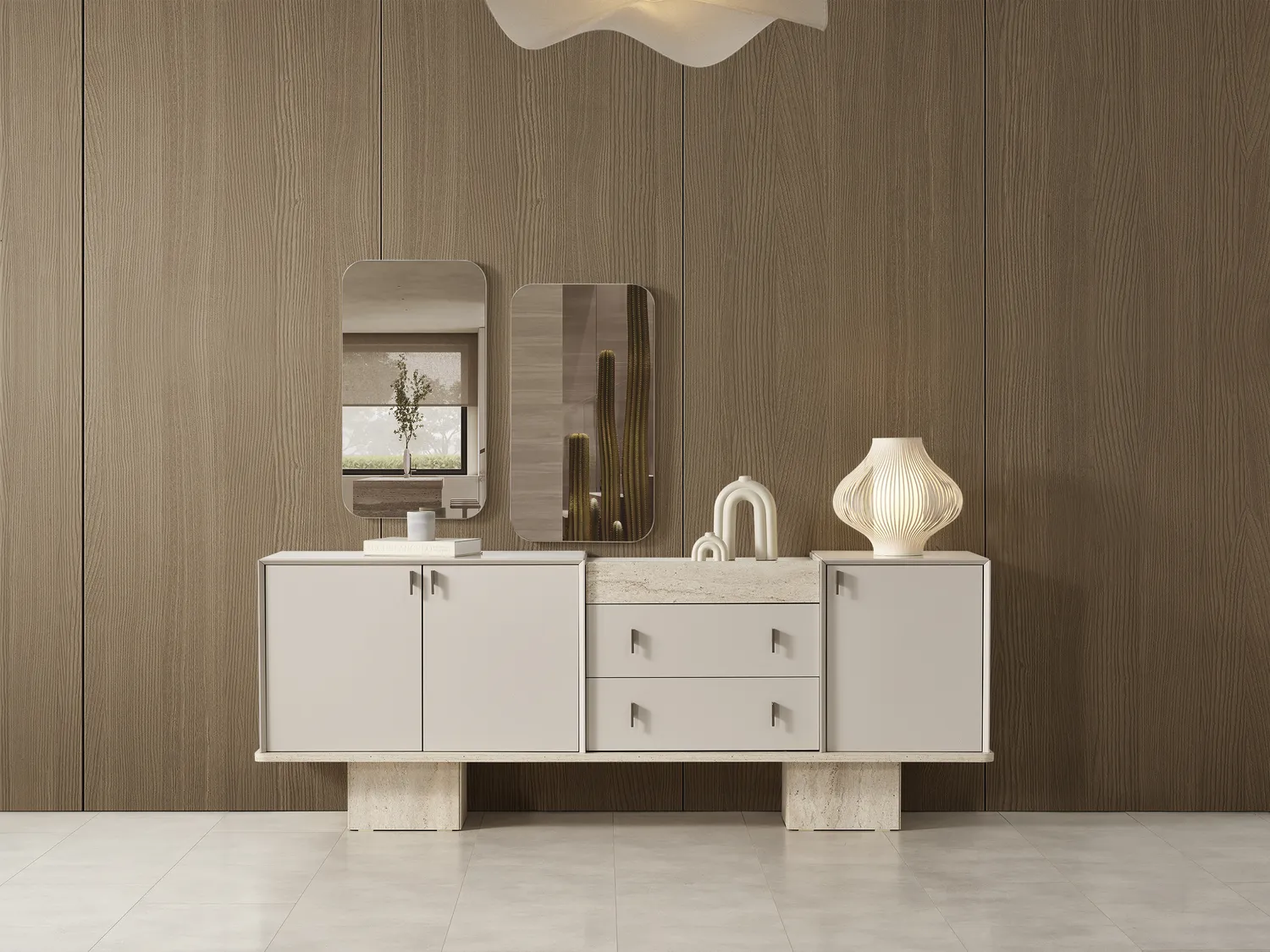 Geniş masa yapısı sayesinde aile yemekleri ve misafir davetleri için konforlu bir kullanım sunarken, depolama alanı geniş konsol ünitesiyle hem estetik hem fonksiyonel bir çözüm sağlar.