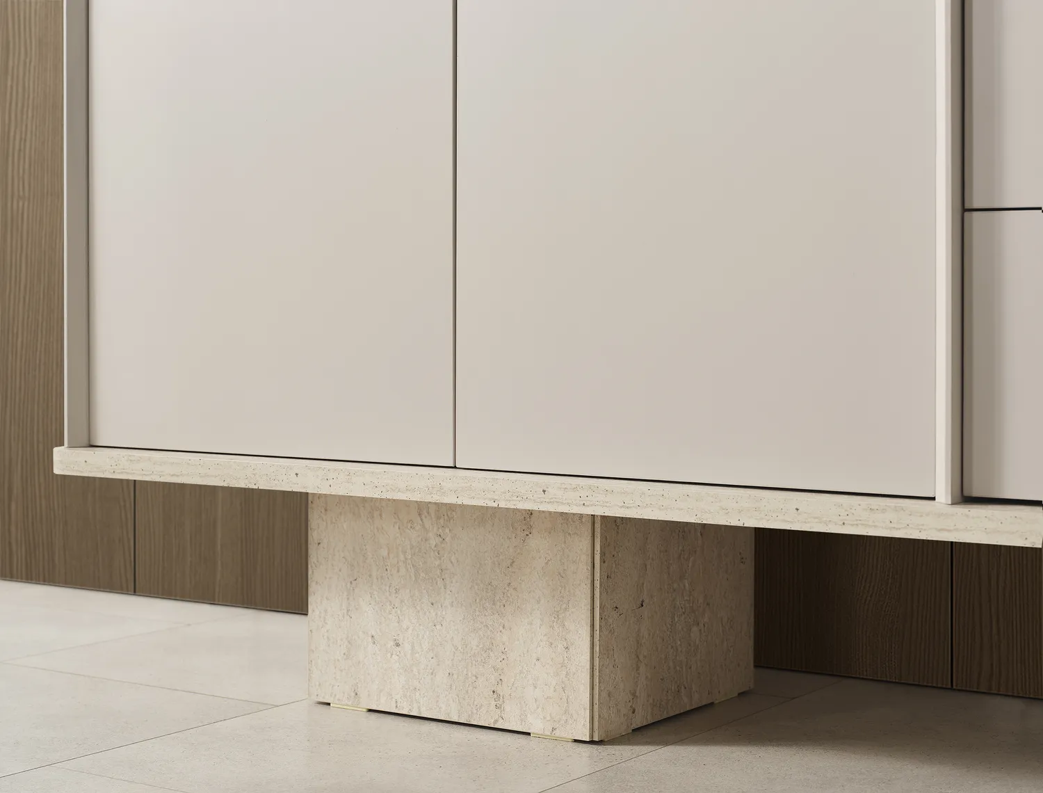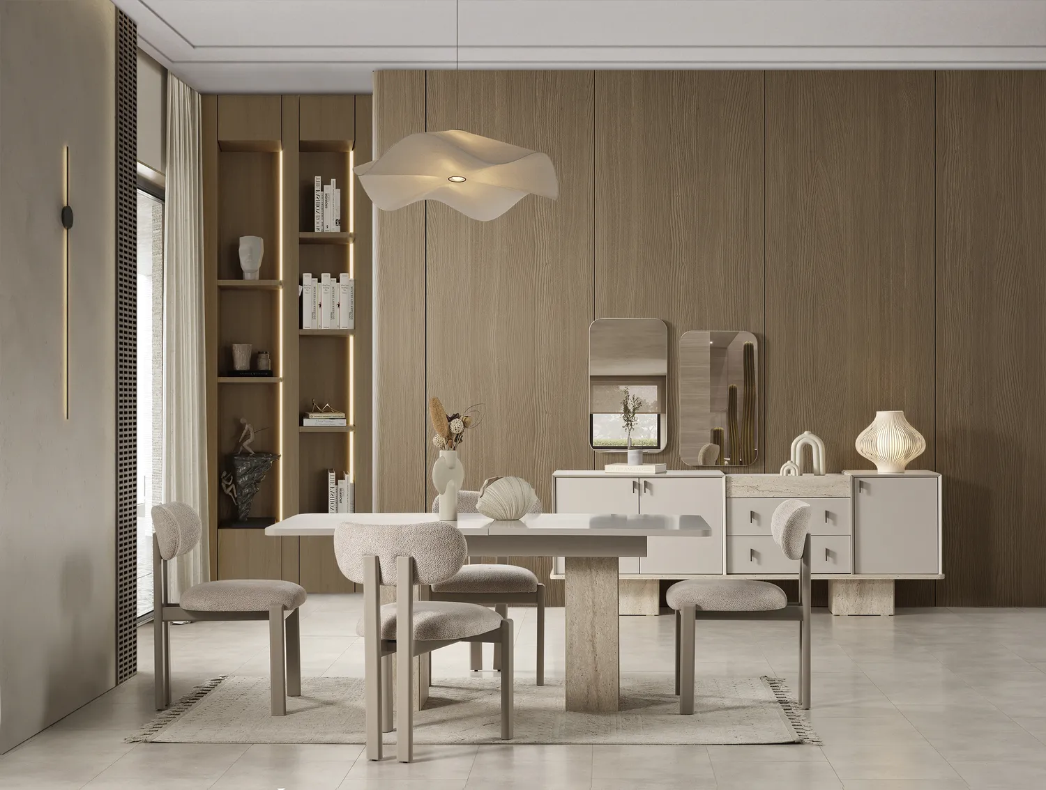 Kapadokya Yemek Odası Takımı, doğal ahşap tonları ve modern beyaz yüzey kombinasyonuyla sade ama güçlü bir tasarım sunar. Minimal çizgileri, blok ayak detayları ve dengeli form yapısıyla hem modern hem zamansız bir yemek alanı oluşturur.