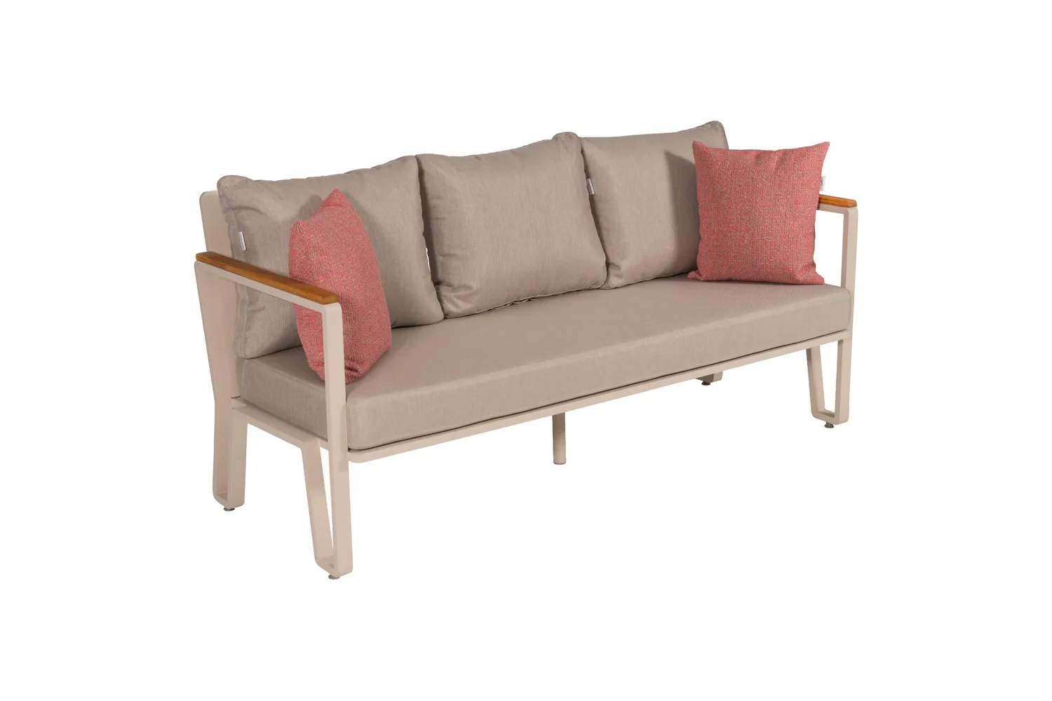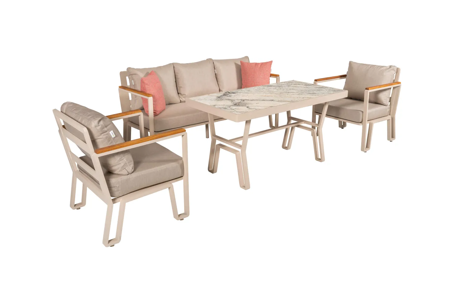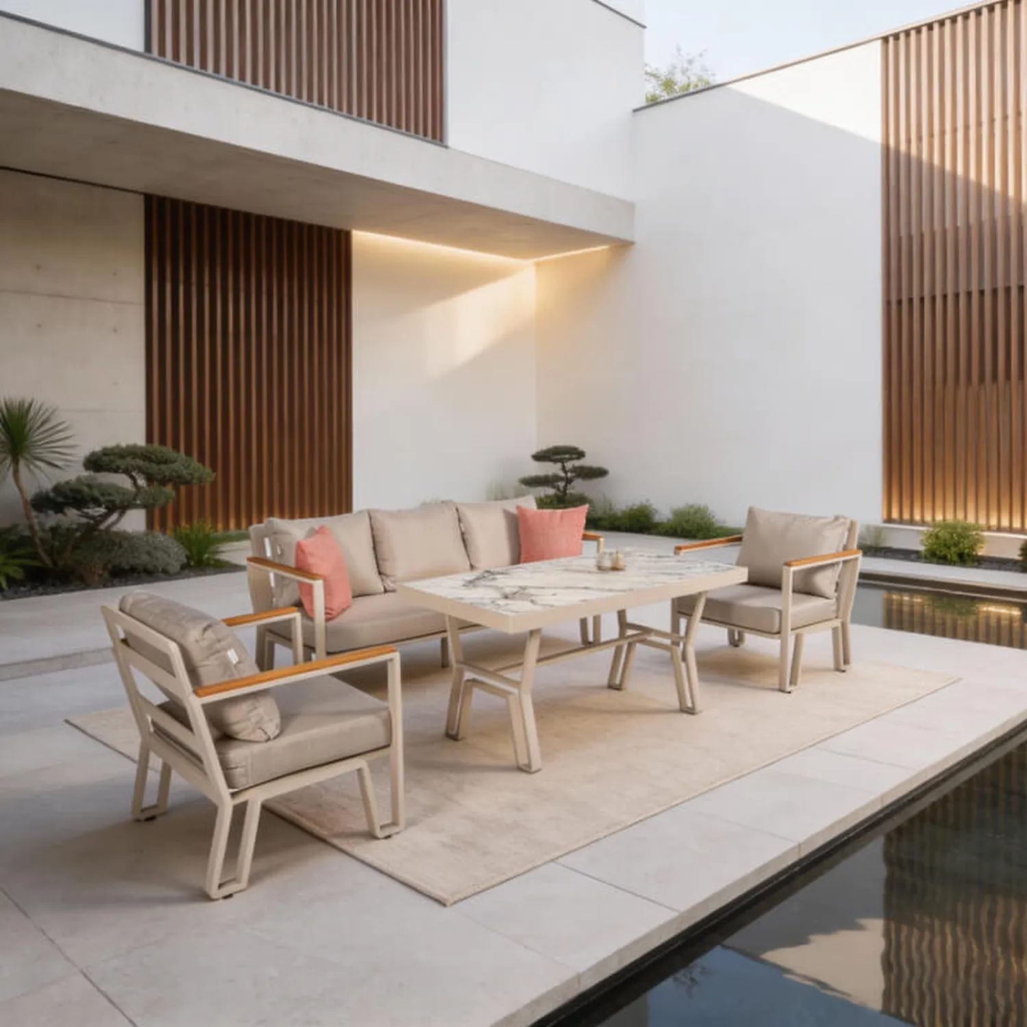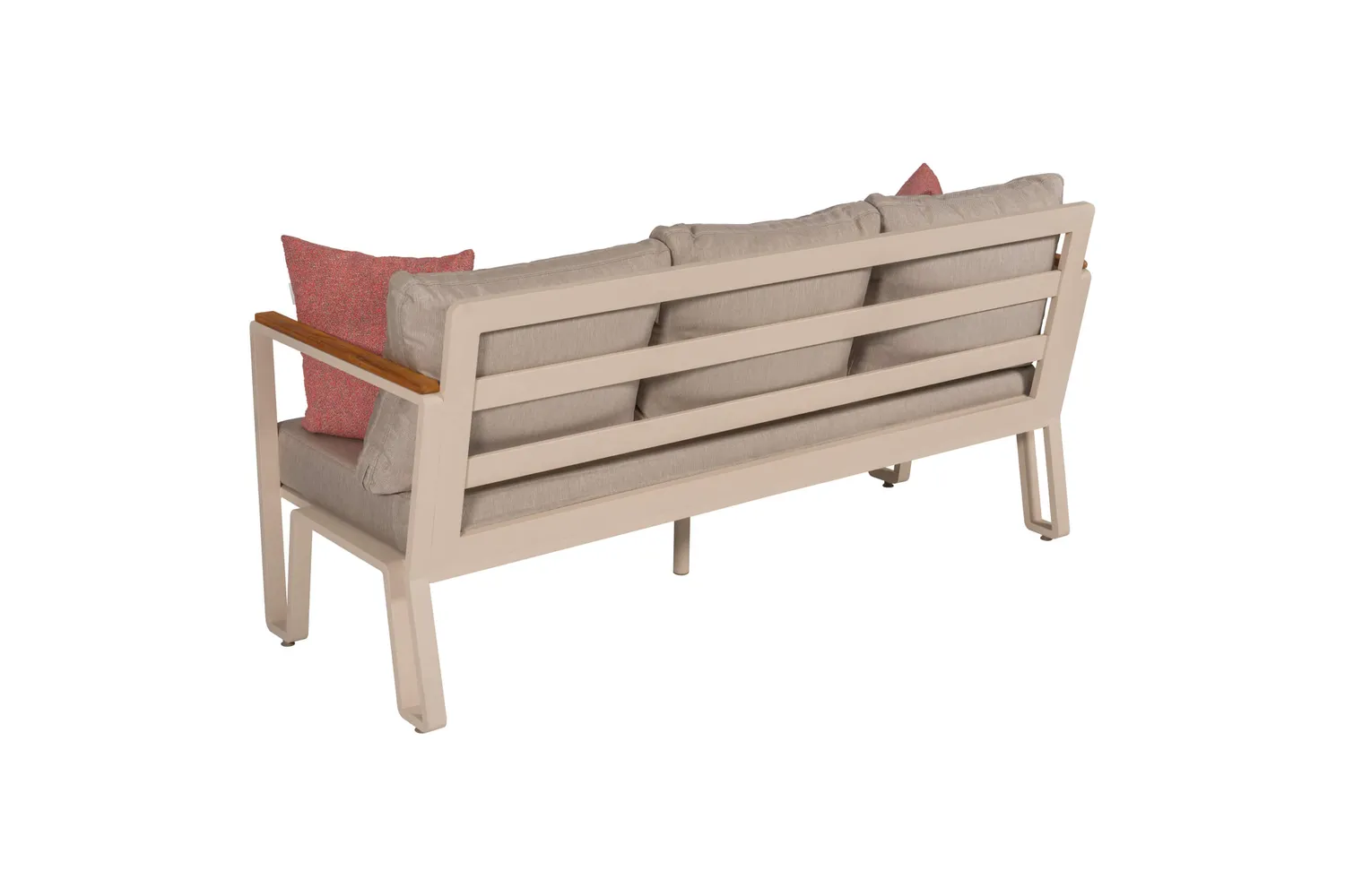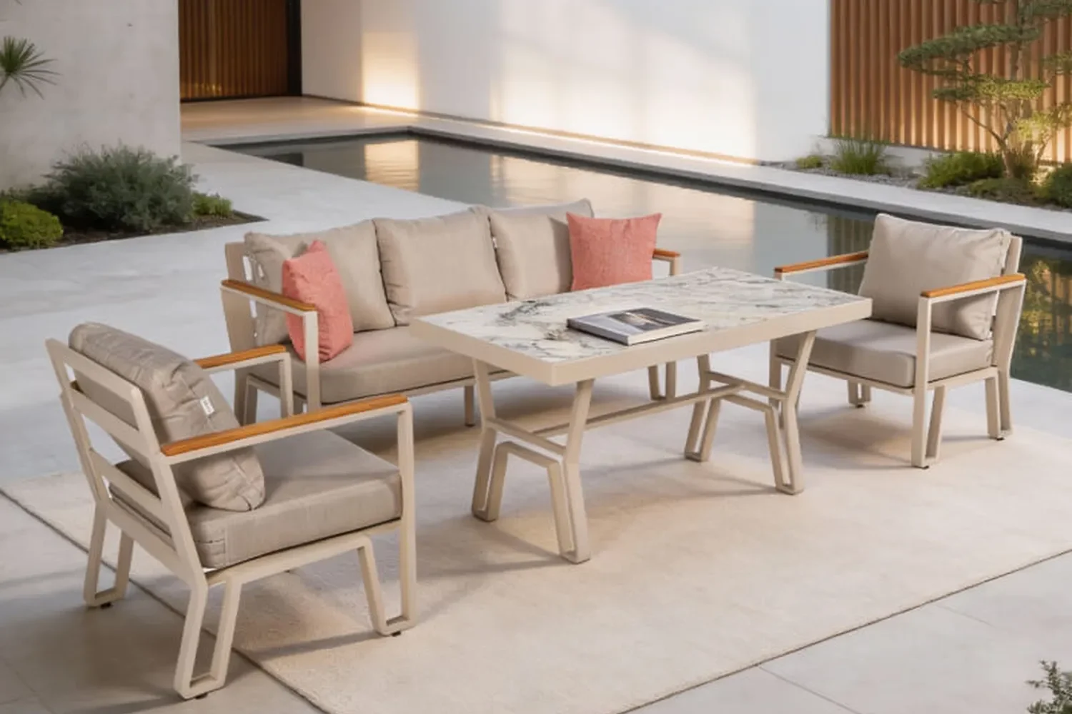 Kiev Üçlü Oturma Grubu; modern tasarımı, sağlam alüminyum gövde yapısı ve doğal görünümlü İreko ahşap kol detayları ile balkon, teras ve bahçeleriniz için hem estetik hem konforlu bir dış mekân oturma alanı sunar. UV stabilizatörlü dış mekân kullanımına uygun yapısı sayesinde güneş ışınlarına ve hava koşullarına karşı uzun ömürlü kullanım sağlar.