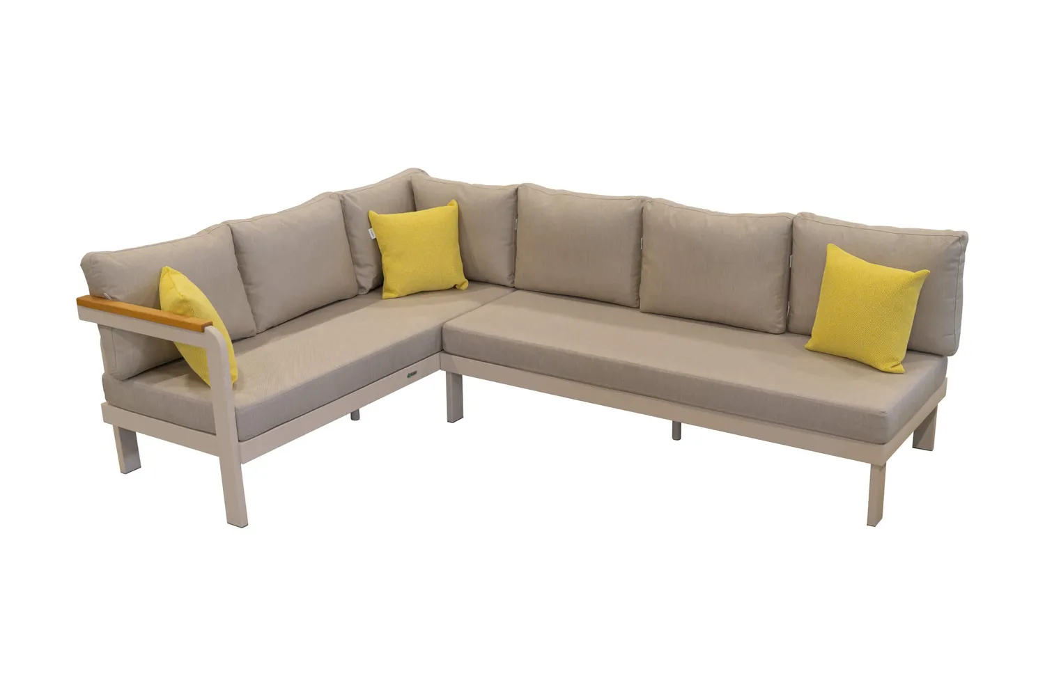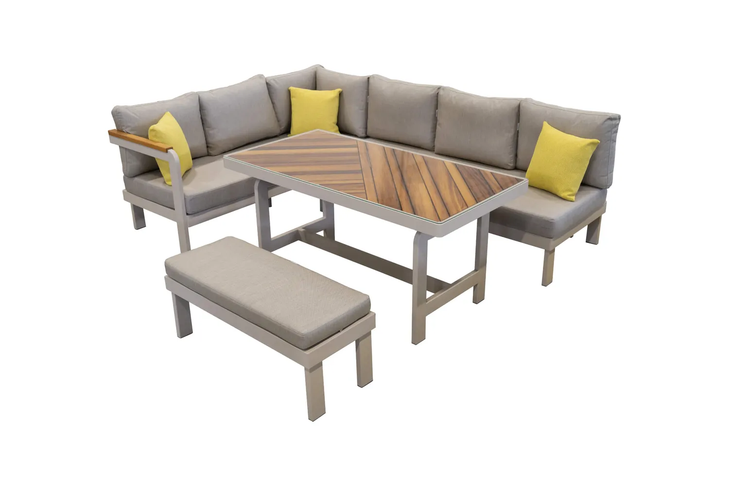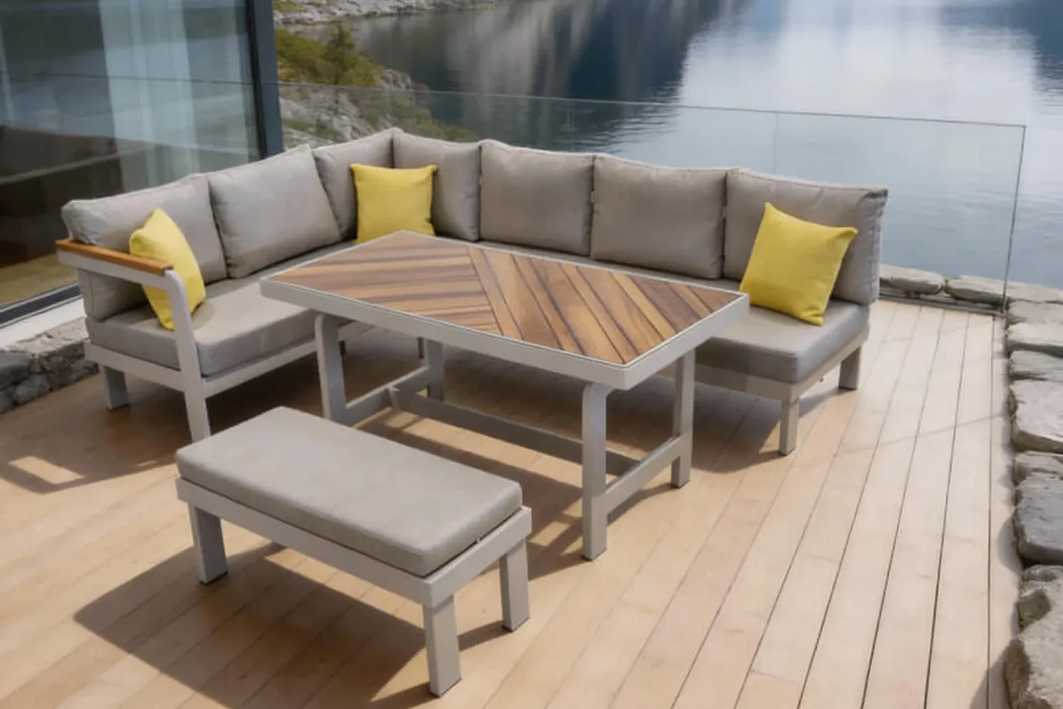 Madrid Köşe Takımı; modern çizgileri, dayanıklı alüminyum gövdesi ve doğal İreko ahşap masa yüzeyi ile balkon, teras ve bahçeler için hem şık hem konforlu bir dış mekân köşe oturma çözümü sunar.