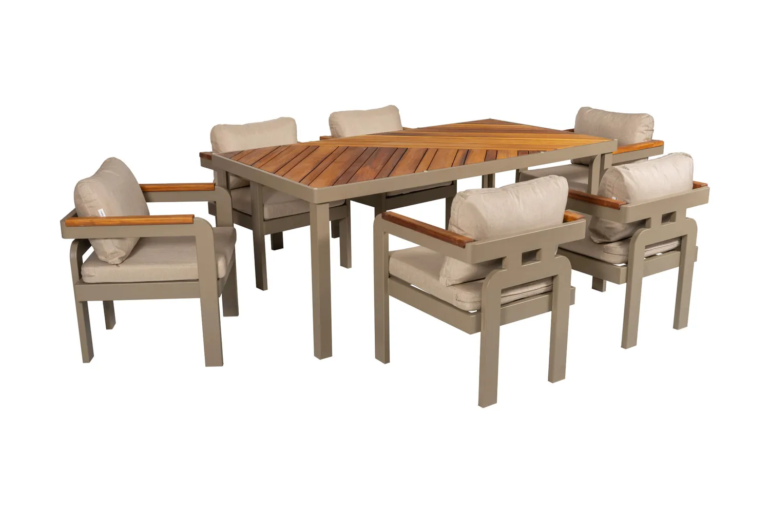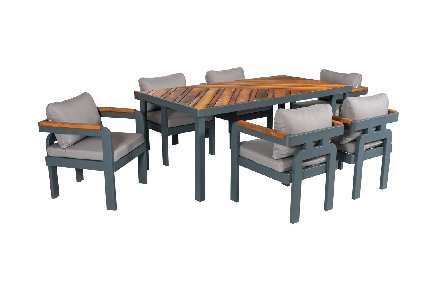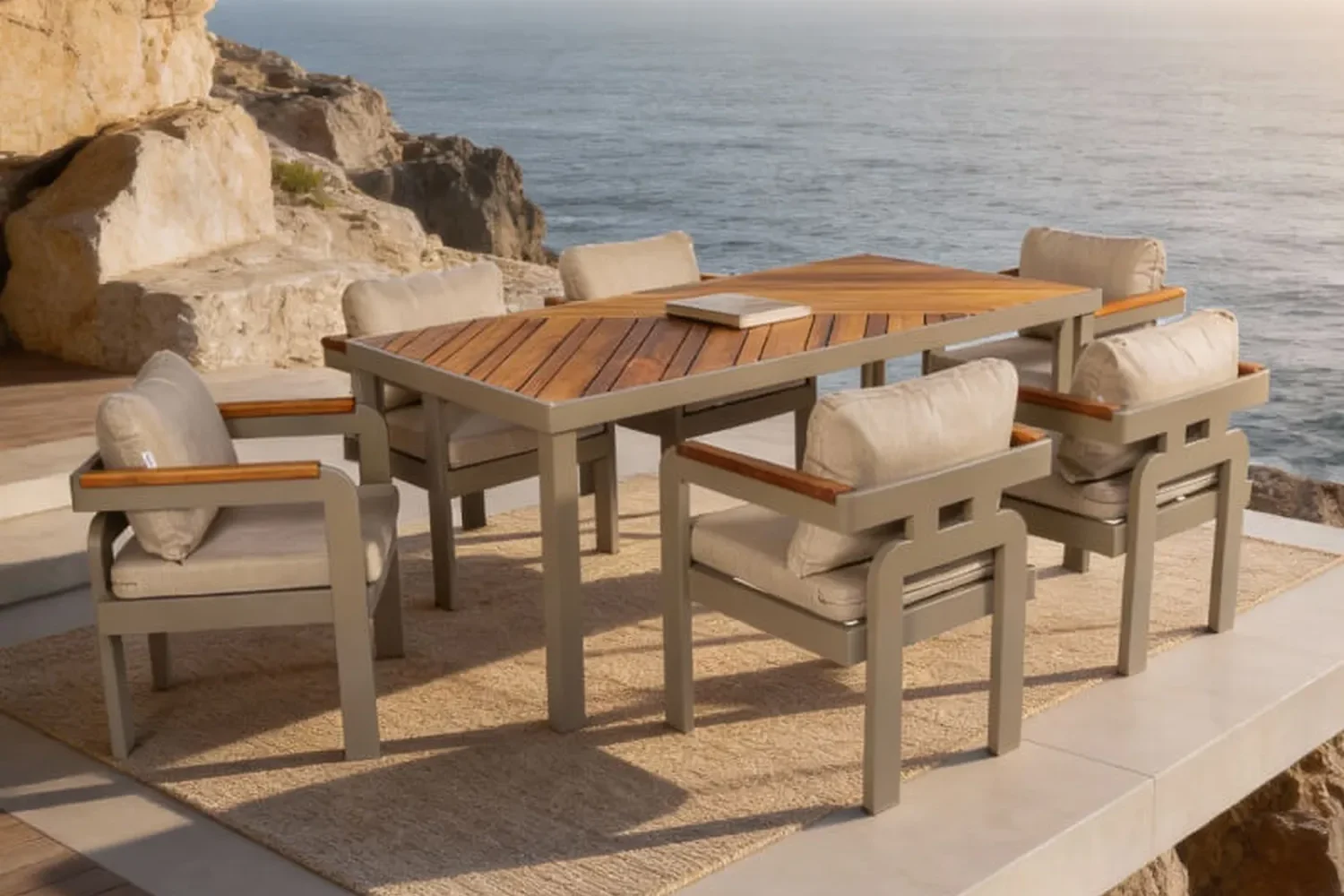 Madrid Masa Takımı; modern alüminyum gövdesi, doğal İreko ahşap masa yüzeyi ve ergonomik minderli sandalye yapısı ile dış mekân kullanımına uygun şık ve dayanıklı bir bahçe yemek takımıdır.