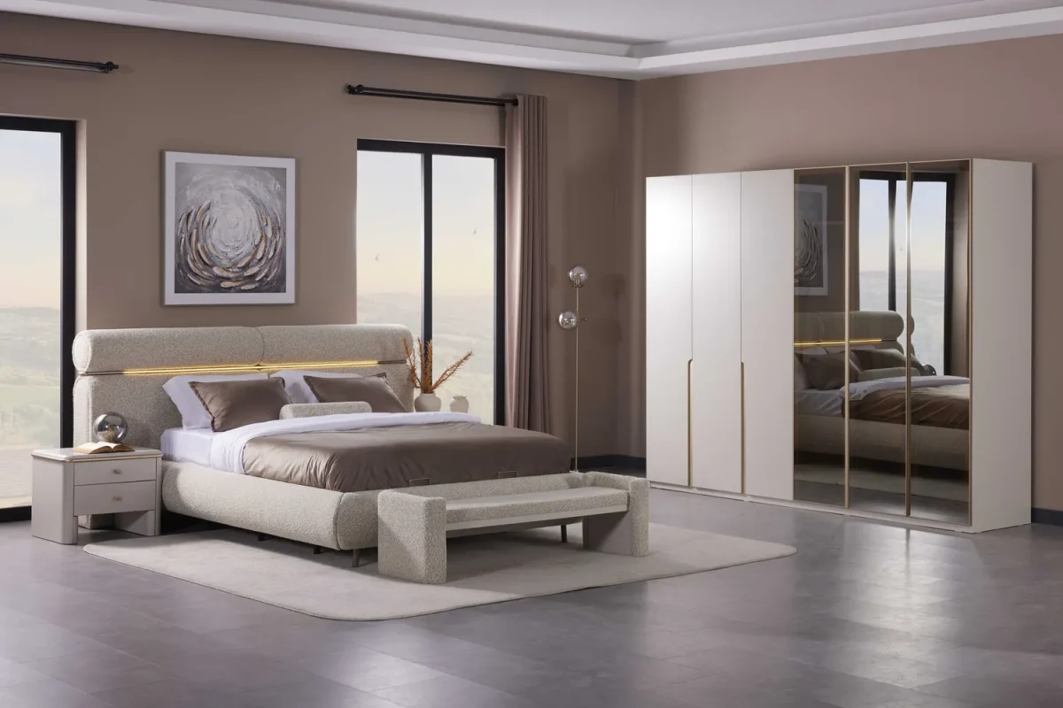Modern çizgiler ve zarif detayların birleşimiyle tasarlanan Prado Yatak Odası Takımı, yatak odalarında şıklık ve konforu bir arada sunar. Yumuşak dokulu başlık tasarımı ve entegre LED aydınlatma detayı sayesinde ortama sıcak ve modern bir atmosfer kazandırır.