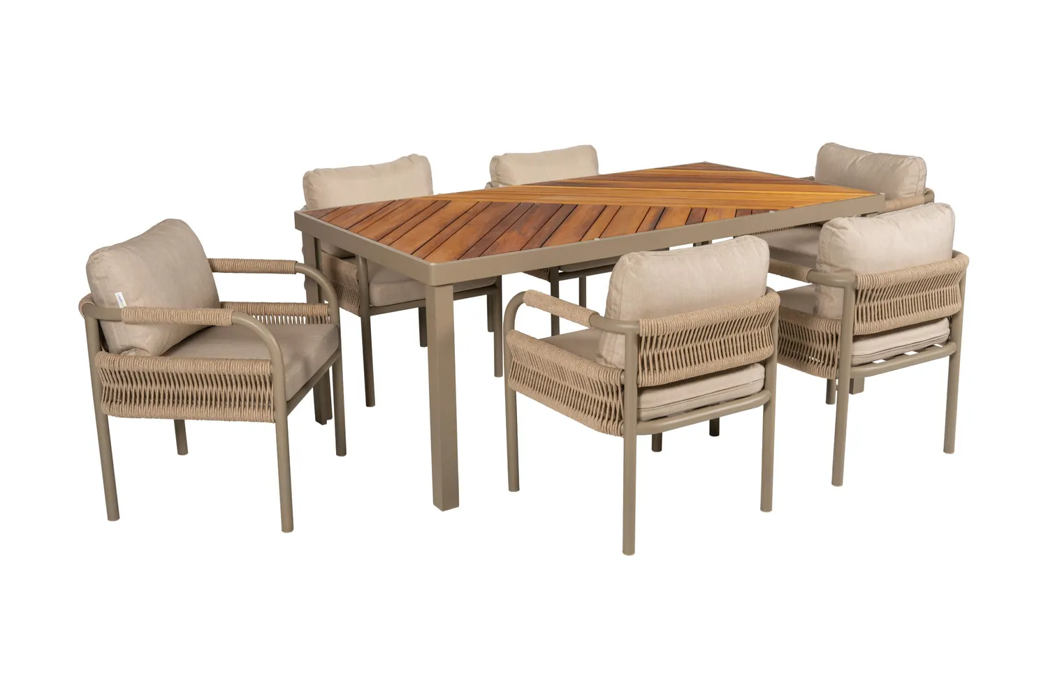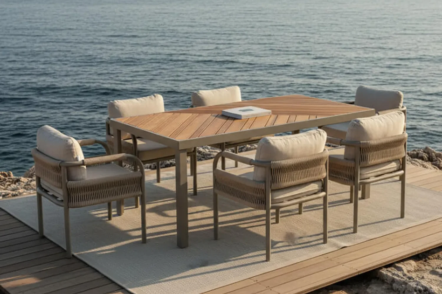 Tokyo Masa Takımı; modern alüminyum gövdesi, doğal İreko ahşap masa yüzeyi ve UV dayanımlı ip örgü sandalye detayları ile balkon, teras ve bahçeler için şık ve uzun ömürlü bir dış mekân yemek takımıdır.